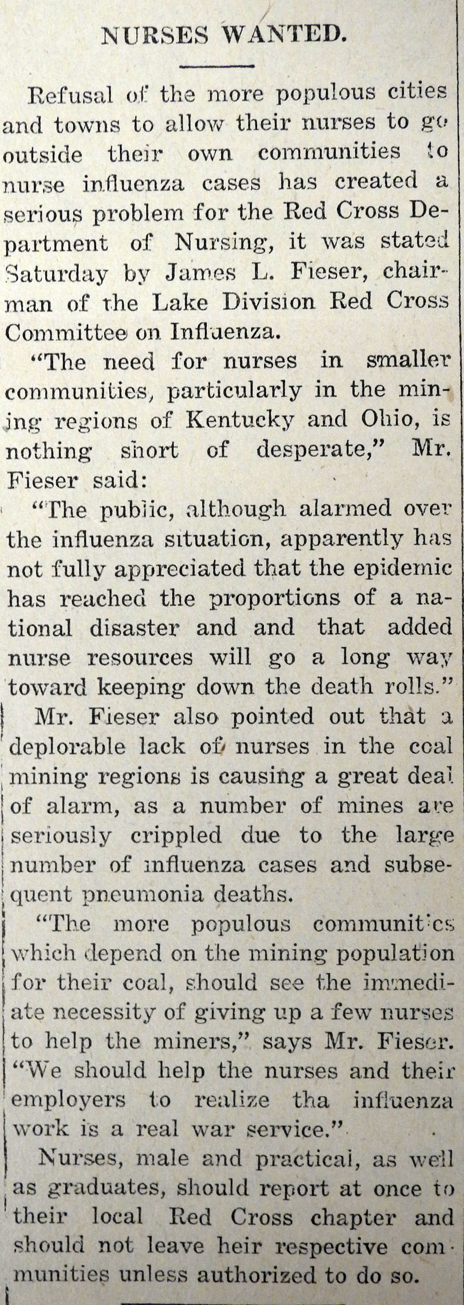 “Nurses Wanted.” The Sentinel, 30 Oct. 1918.