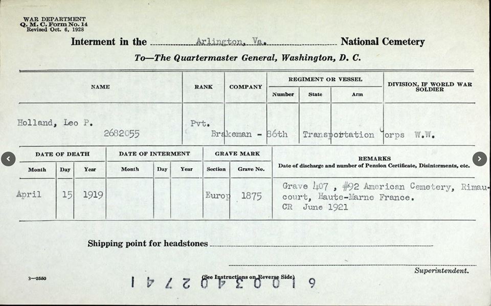 Marne. Body to be returned to US, and interred in Arlington National Cemetery, Washington DC in the Argonne Cross area.